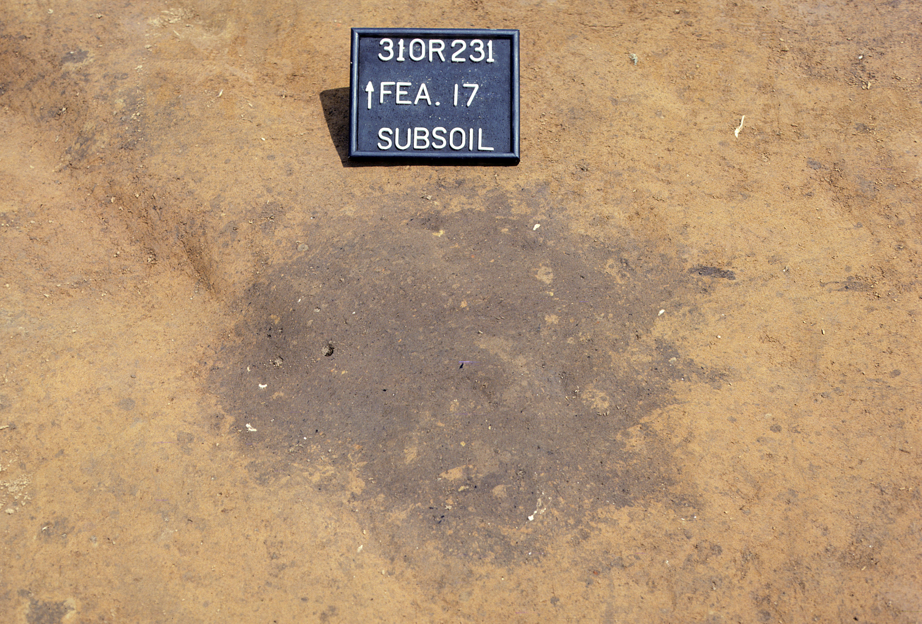 Feature 17 was an almost circular pit located within Structure 9 at 233.5R77.5. It measured 2.7 ft by 2.4 ft in plan view and was 2.1 ft deep. In profile, the pit was barrel-shaped with walls that sloped slightly inward at the top and bottom. The pit fill consisted of three zones. The upper zone (Zone 1) was about one foot thick and contained dark brown loam with charcoal. Scattered throughout this zone, there were also pockets of orange-yellow clay. Beneath Zone 1 was a thick (1.1 ft) layer of gray ashy soil (Zone 2) which extended to the bottom of the pit. This soil was loosely packed, damp, and contained a large number of animal bones and artifacts (e.g., glass trade beads, lead shot, charcoal, a clay pipe bowl, a case knife, an ember tender, stone and pottery disks, numerous potsherds [including part of a Fredricks Plain jar], a hammerstone, a chunkey stone, stone flakes, and chipped stone projectile points). This storage pit had been backfilled in at least two episodes of refuse disposal.