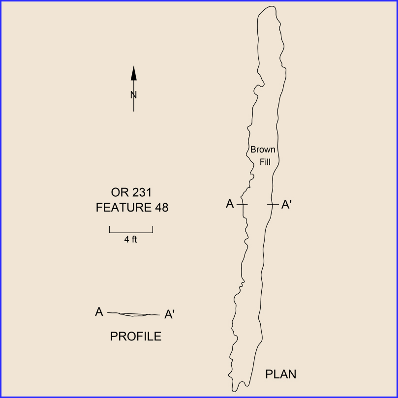 This designation was assigned to a 35-ft segment of a long, irregular trench that ran in a north-south direction and intruded Structure 10 and Structure 11. It averaged approximately 2.5 ft wide, 0.3 ft deep, and contained small amounts of pottery, rock, and European-made artifacts (primarily glass beads). Thin traces of this feature were observed at the north end of the excavation in 1985 but were not excavated. This earlier evidence, coupled with the 35-ft section excavated in 1986, indicate that the trench was at least 75 ft long. Although this feature certainly post-dates both structures, it cannot be firmly associated with later Euroamerican activity in the site vicinity. This conclusion is based on the fact that no Euroamerican artifacts were found in the trench that post-date the Occaneechi occupation of the site. The exact nature and function of this feature is unknown.