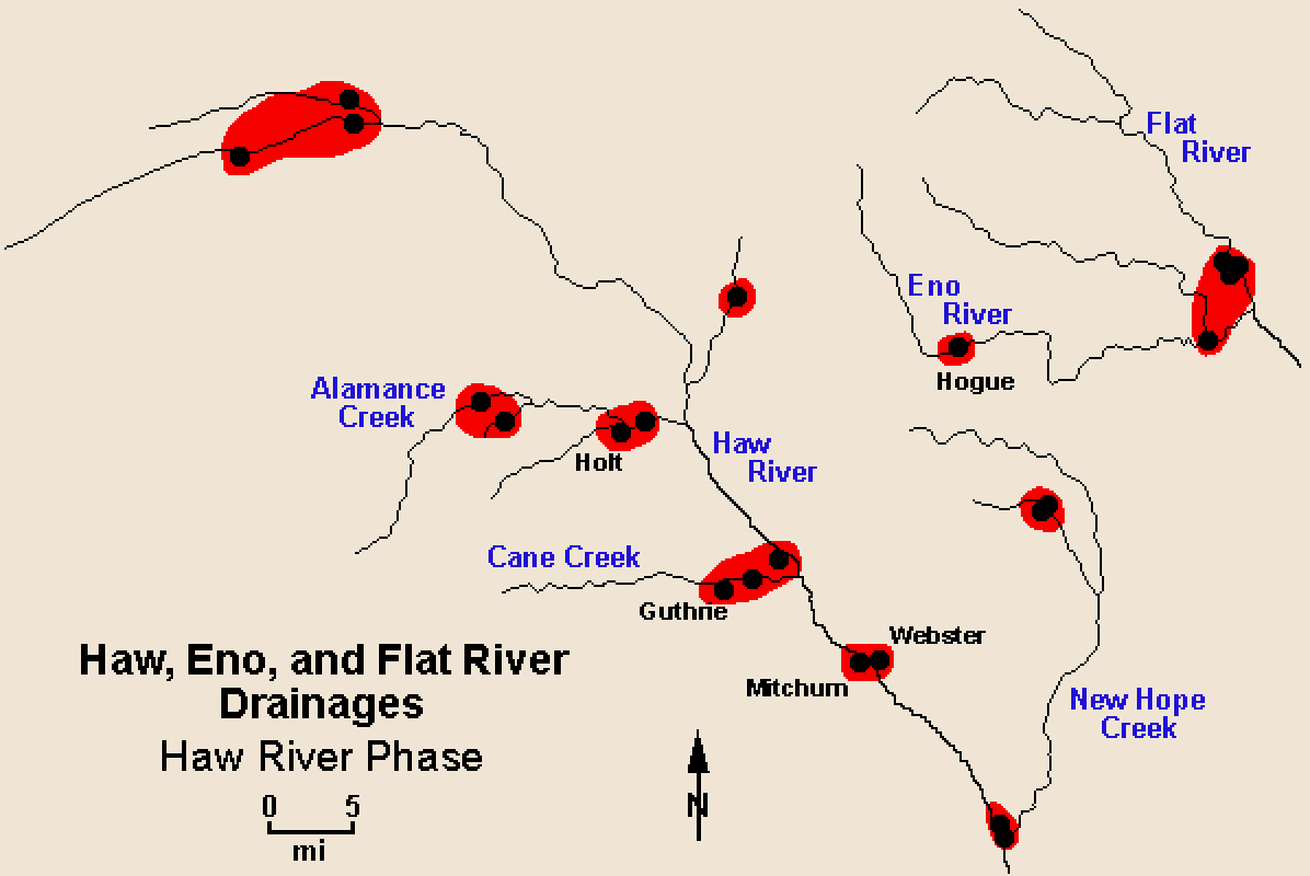 Over 20 sites within the Haw, Eno, and Flat drainages have produced substantial collections of Dan River series pottery (see distribution map). Five of these sites have been excavated. Most represent small settlements comprised of widely dispersed households with associated storage pits, hearths, and burials. The low frequency of artifacts at these sites and the scarcity of pit features probably reflect both a low population density and a lack of extended site occupation. At the Guthrie site (RLA-Am145), for example, intensive, systematic auger testing (at 2.5-ft intervals) over a 0.55-acre area identified only seven pit features: one shallow basin, three pit hearths, one burial, and two possible burial pits. Extensive auger testing at several other sites also has identified only isolated or widely scattered pit features. Alternatively, some Haw River sites appear to represent small, compact communities made up of multiple households. The Holt site (RLA-Am163), situated atop an upland knoll near Alamance Creek, is an example of such a settlement. This site was defined by a dense surface scatter of artifacts over a 0.25-acre area, and excavations uncovered several trash-filled storage pits.