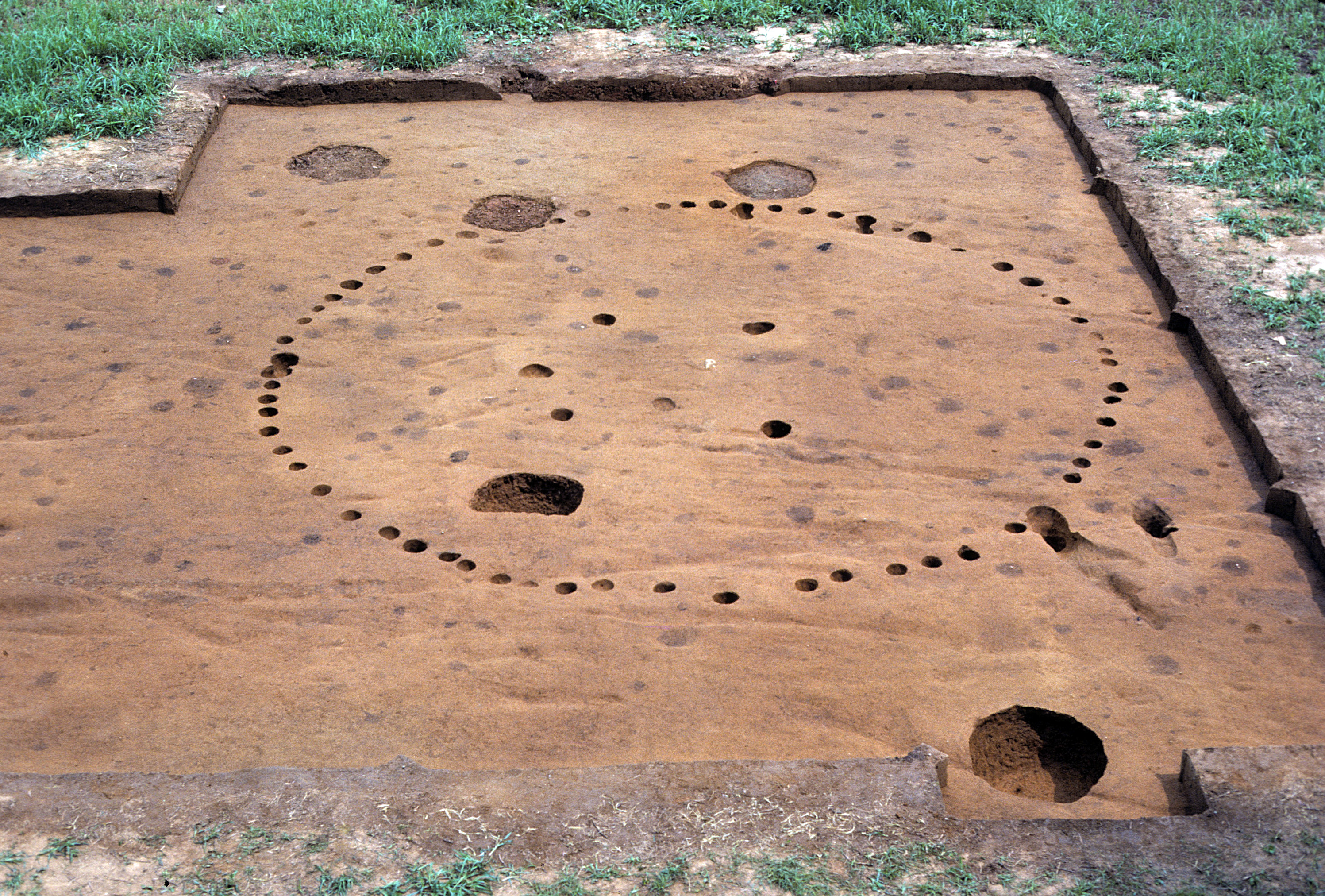 Here's the same structure after the postholes and pits have been excavated. This structure was originally a house, some 23 feet in diameter. The framework consisted of saplings, which were driven into the ground, then bent over and lashed together at the top to support the roof. The walls and roof, now gone, were probably covered with bark, woven mats, or thatch. This is the kind of house in which a family would have lived. Most of the structures at Occaneechi Town are not as well-preserved as this one.