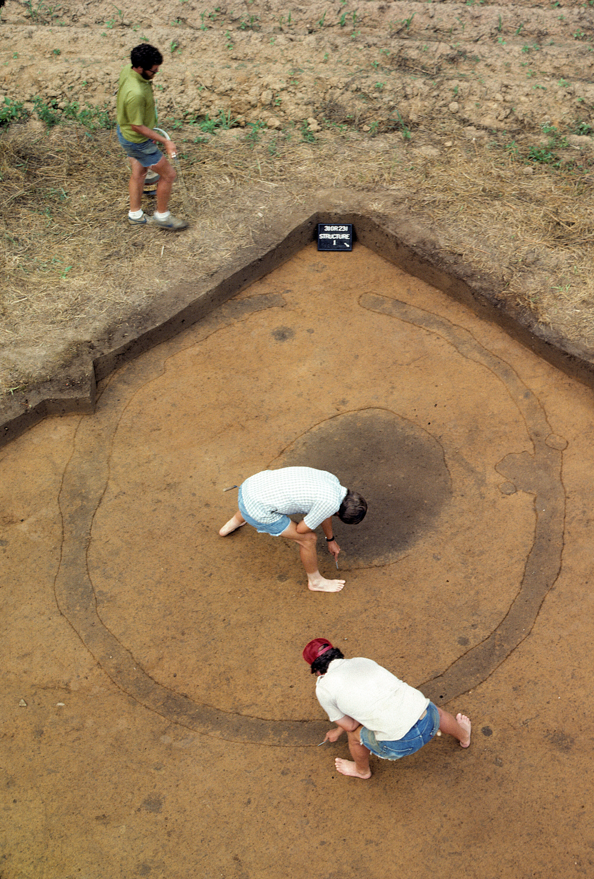 Here's another kind of structure. Note that the wall is marked by a continuous circular stain, rather than by individual post holes. This sort of stain indicates a wall trench, into which the posts supporting the wall and roof were placed. This wall was probably much heavier than that of a regular house. Also note the big feature in the center of the house. When excavated, this turned out to be a fire pit, full of charcoal and burned rocks.