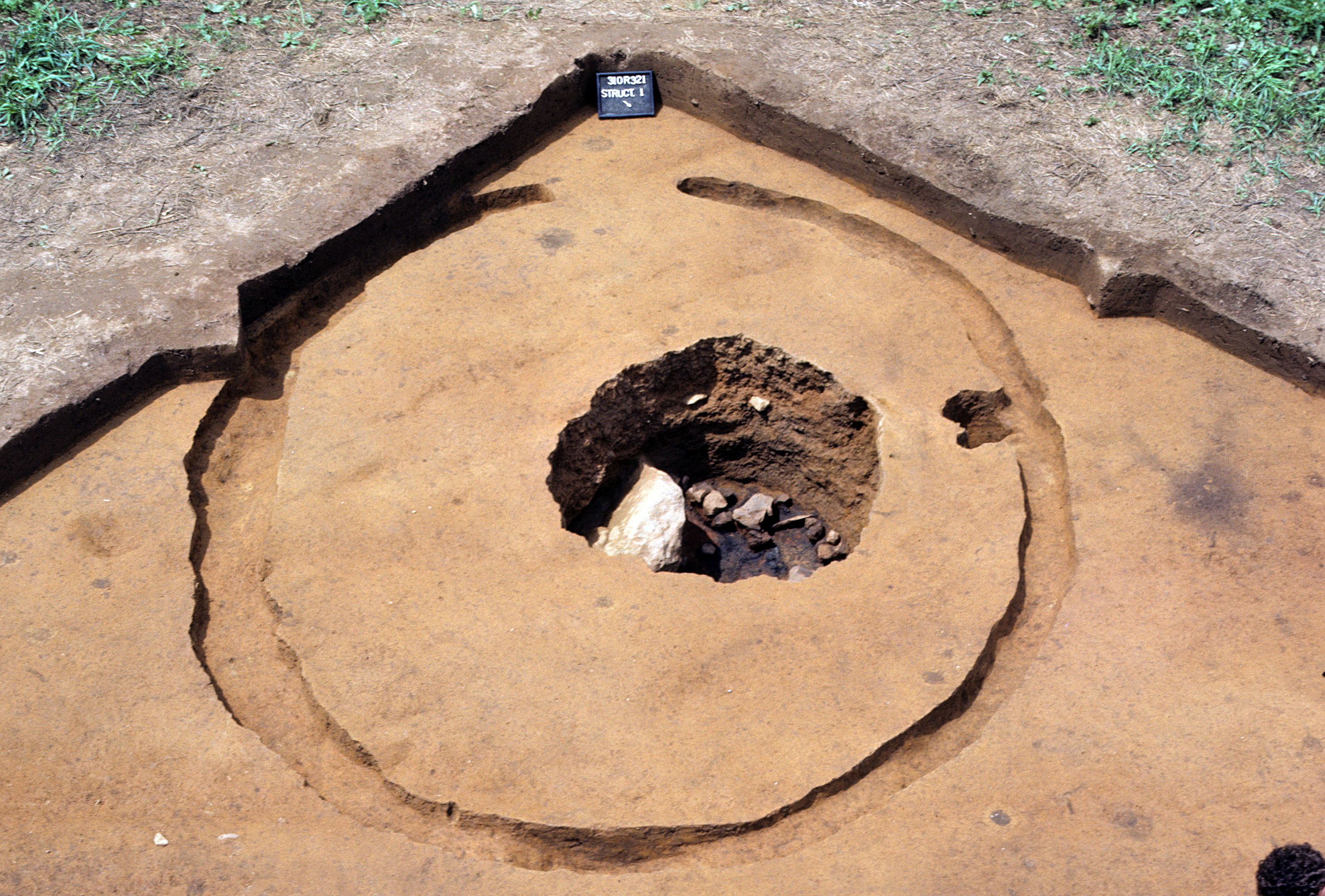 Here's the same building after the wall trench and fire pit were dug out. It was only about 11 feet in diameter and we believe it was a sweat lodge. A fire would be built in the central pit, heating up the building and causing the people inside to sweat profusely. Water would be poured on the hot rocks in the pit to produce steam, much like in a modern steam bath. Such buildings were used by members of the community for healing and purification. Only remnants of wall trenches remain for most houses of this type of construction at Occaneechi Town.