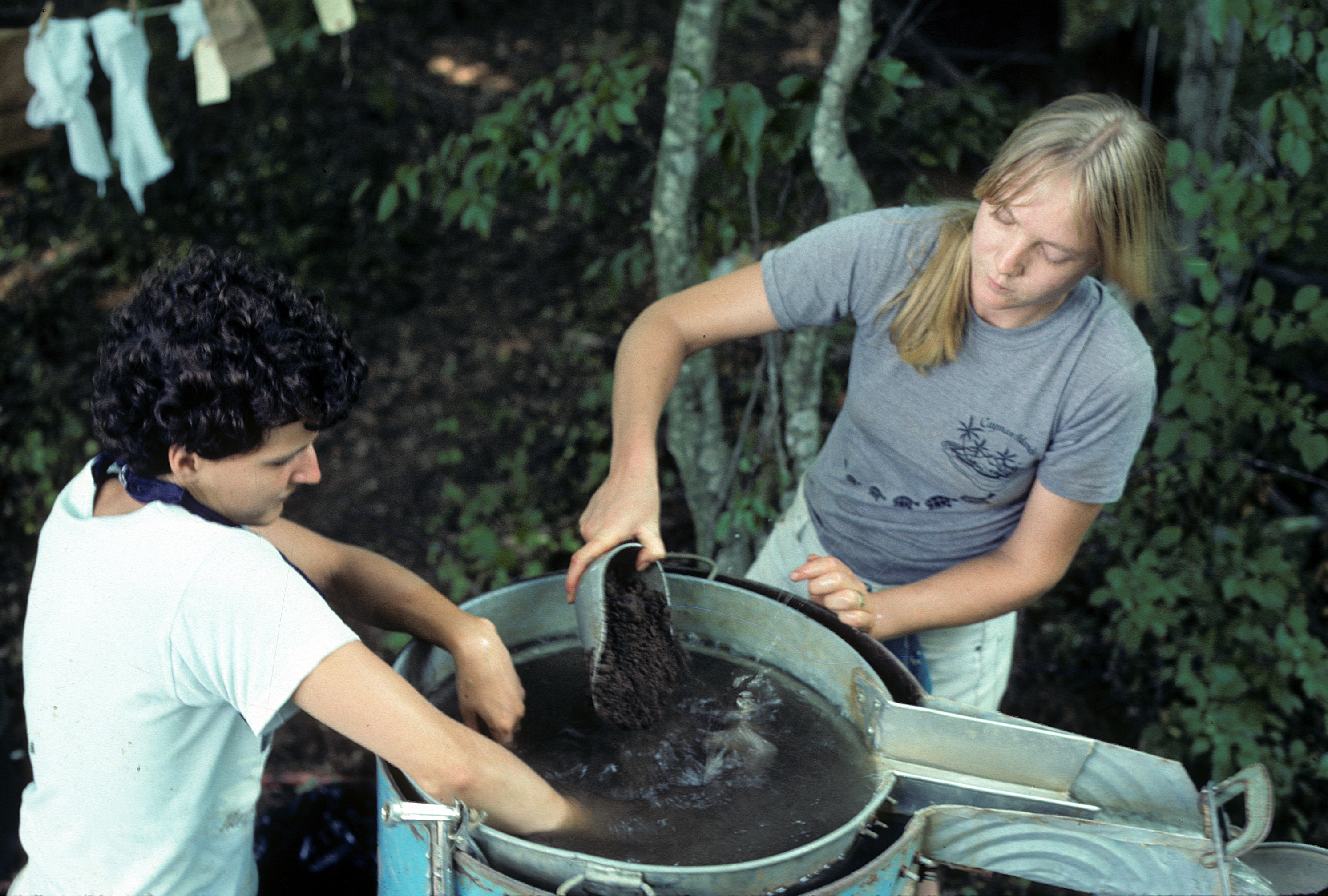 A smaller sample of soil from each feature (everything that was in the bucket) is subjected to flotation. This process involves another contraption, made from an old metal barrel, in which charred plant remains are gently floated out of the soil with flowing water and caught in a fine screen. These tiny bits of charcoal, when properly identified, tell us which plants were grown as crops, which were gathered in the wild, and which kinds of wood were used for fuel.